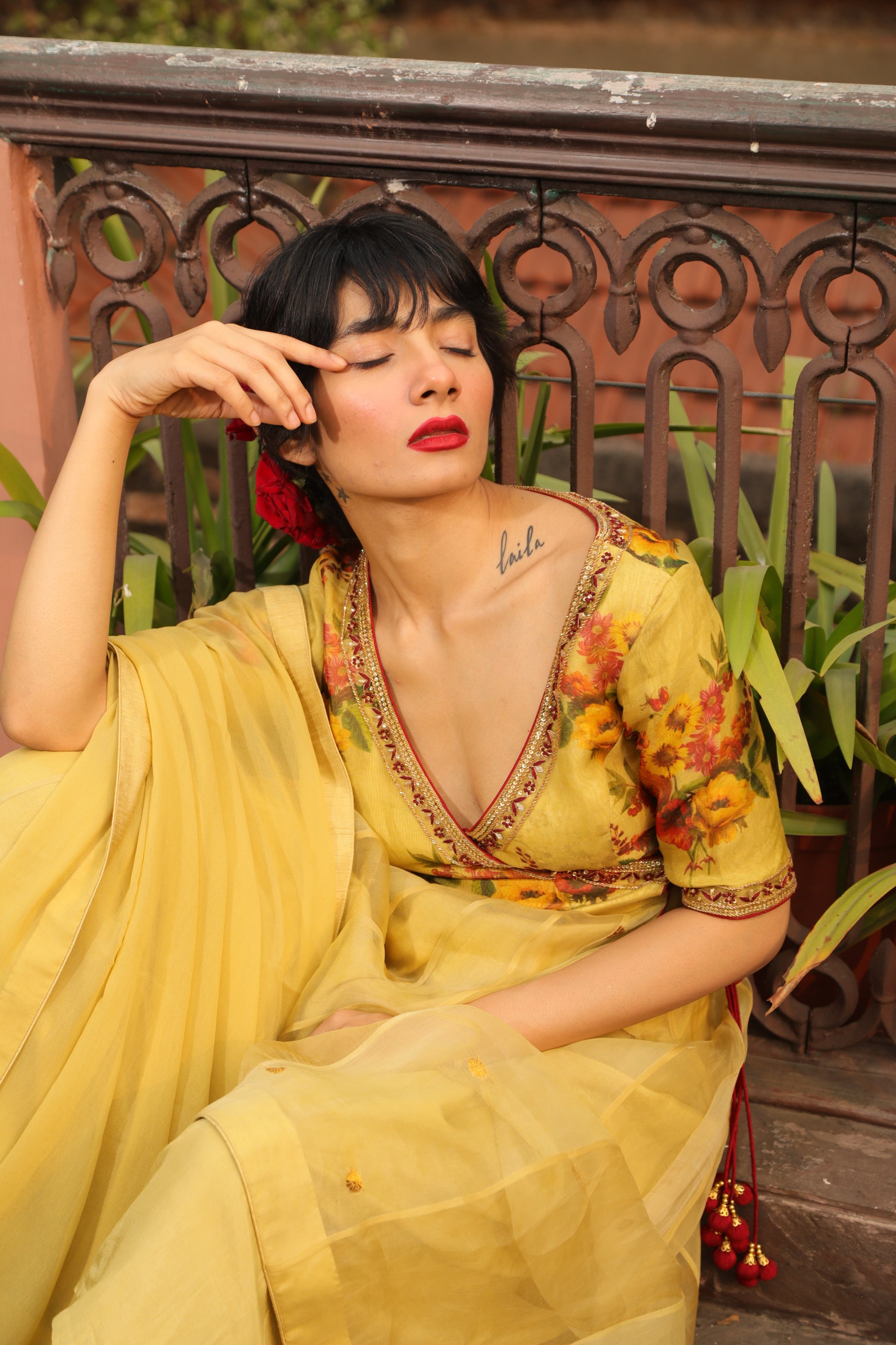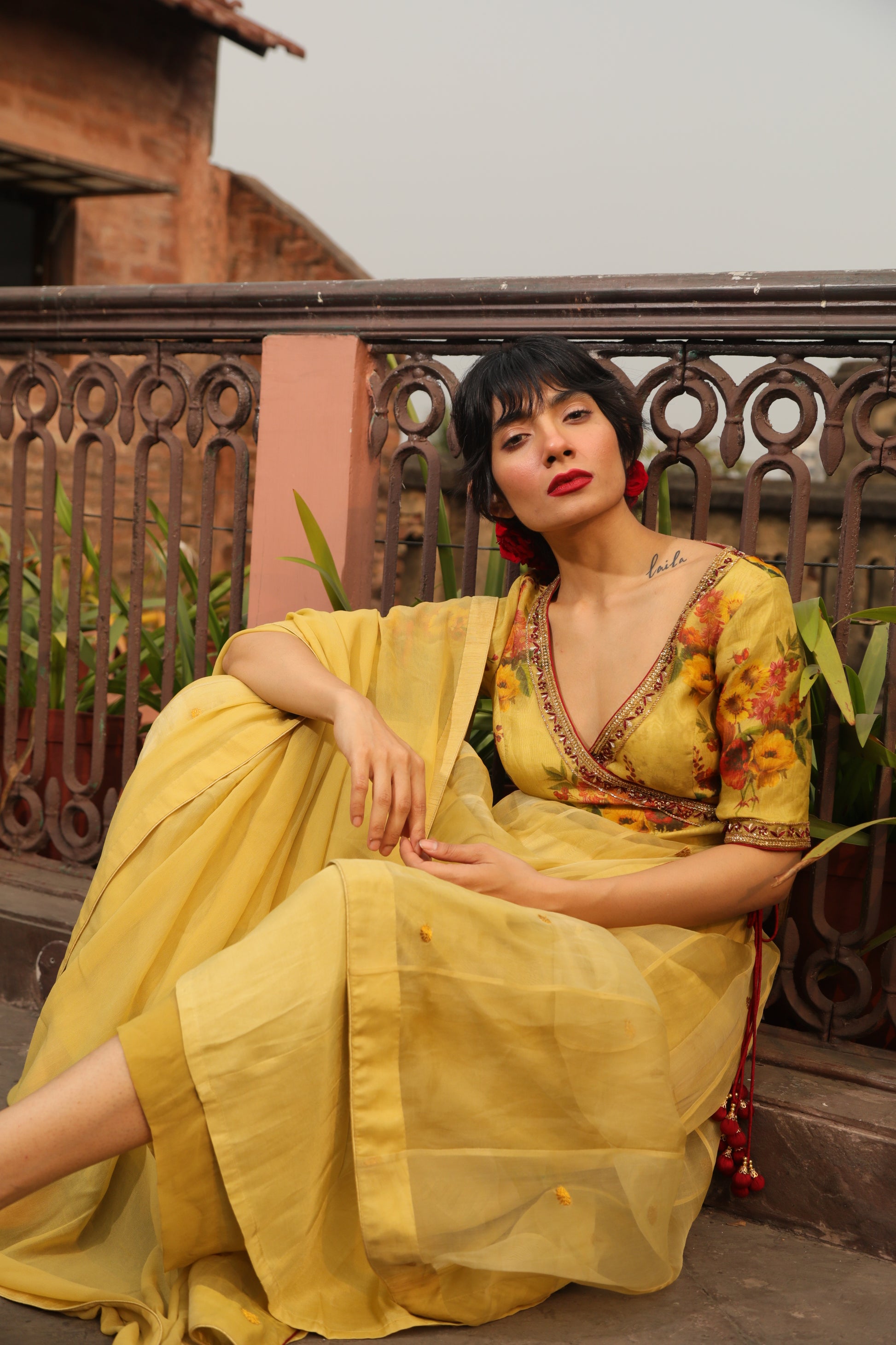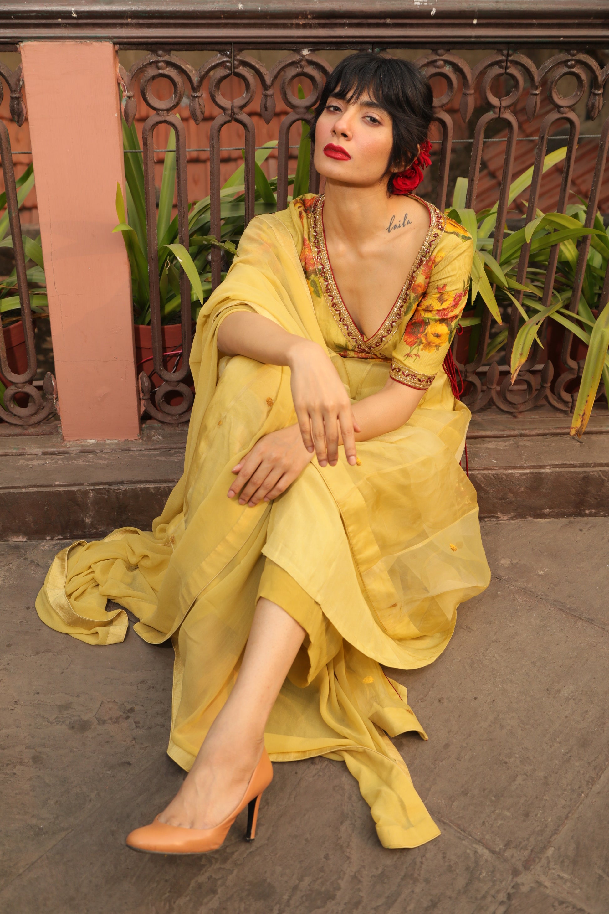 Our elegant rich handwoven Assam Paat (Silk) Mustard Yellow Aangrakha Style Anarkali has pure floral print silk organza on yoke and sleeves and is enriched by small zari Butas all over. The neck and sleeves are highlighted with zardozi work, complemented with tone-on-tone georgette palazzo and dupatta.