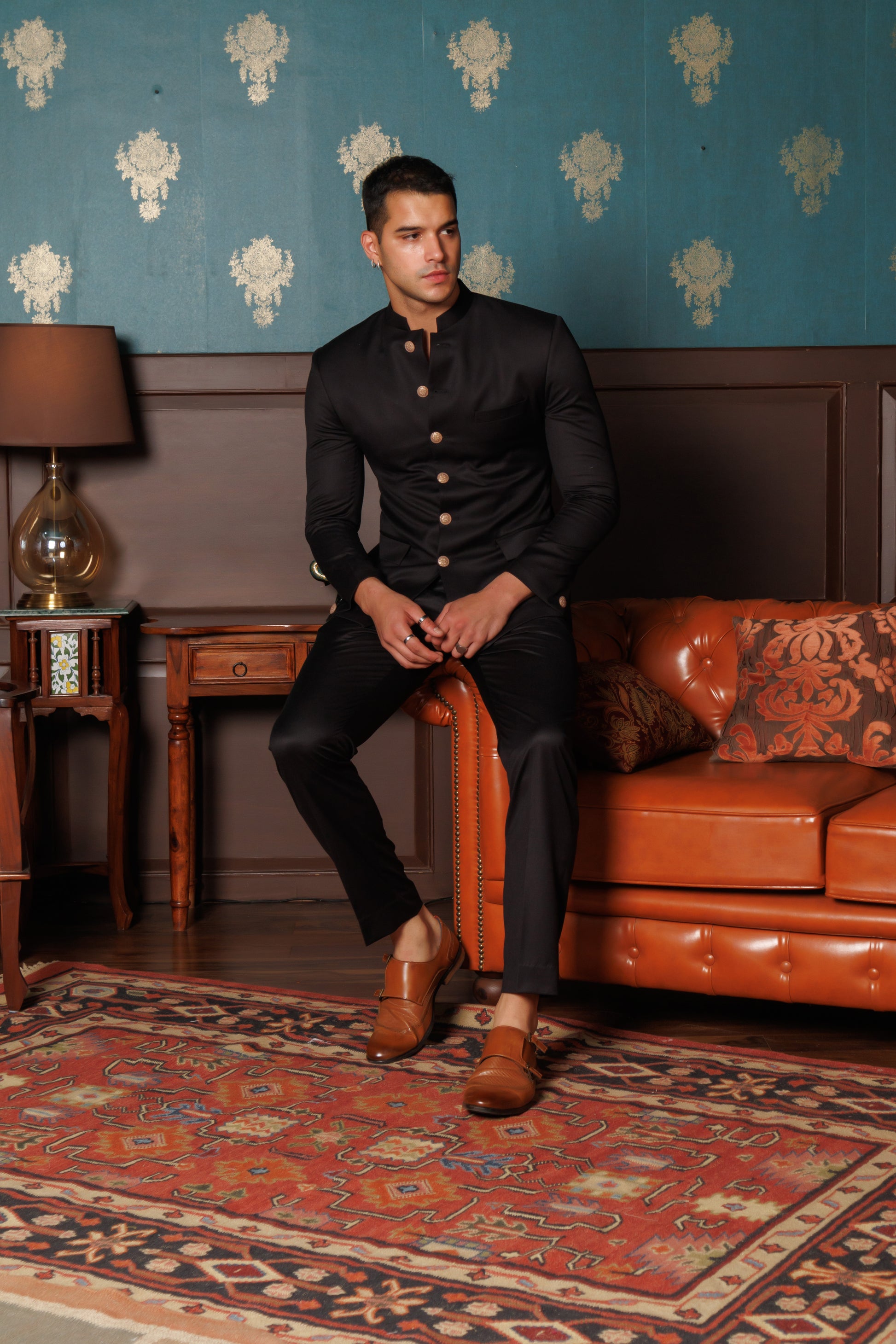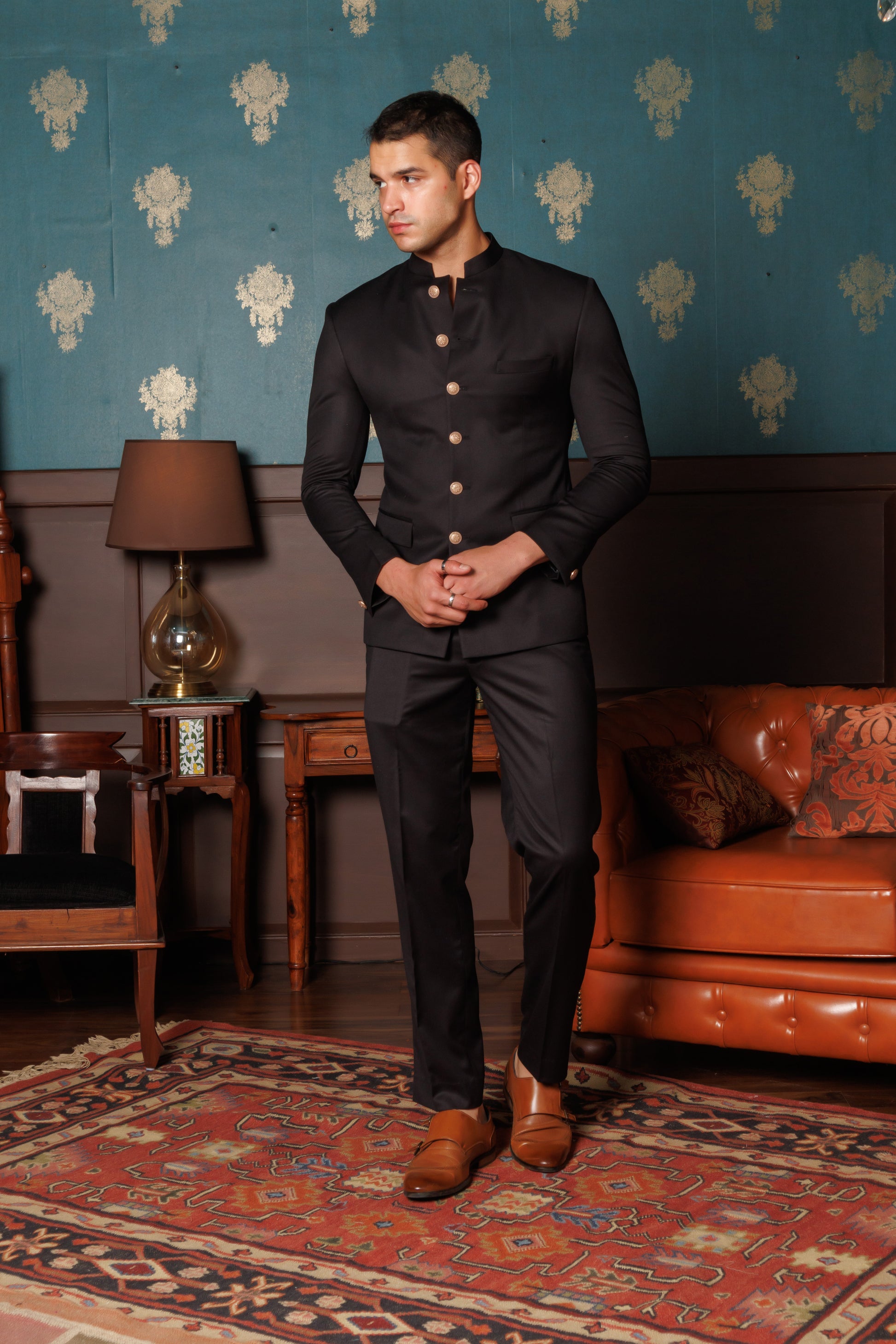 Turn heads by sporting our bespoke bandhgala suit finished with antique gold buttons, with matching trousers for your next formal event!