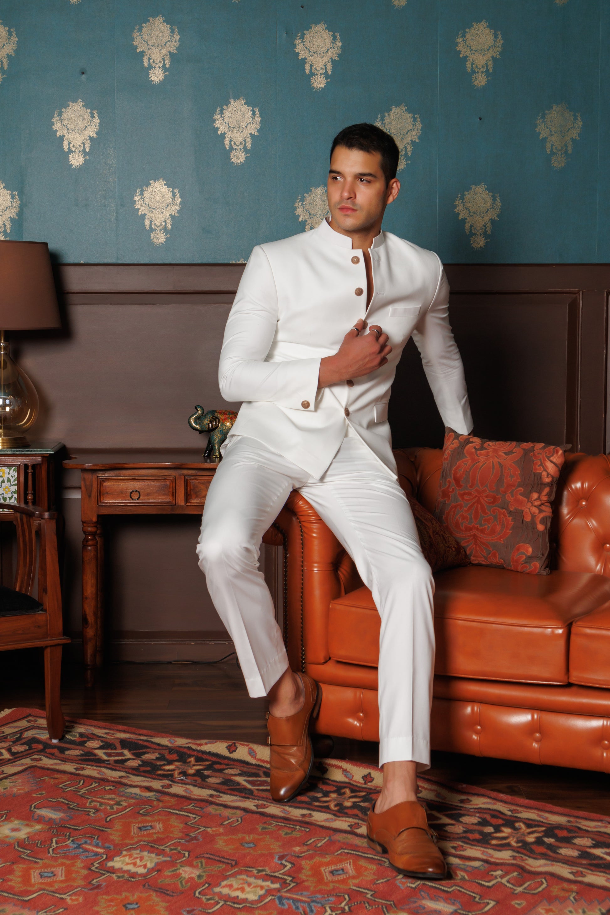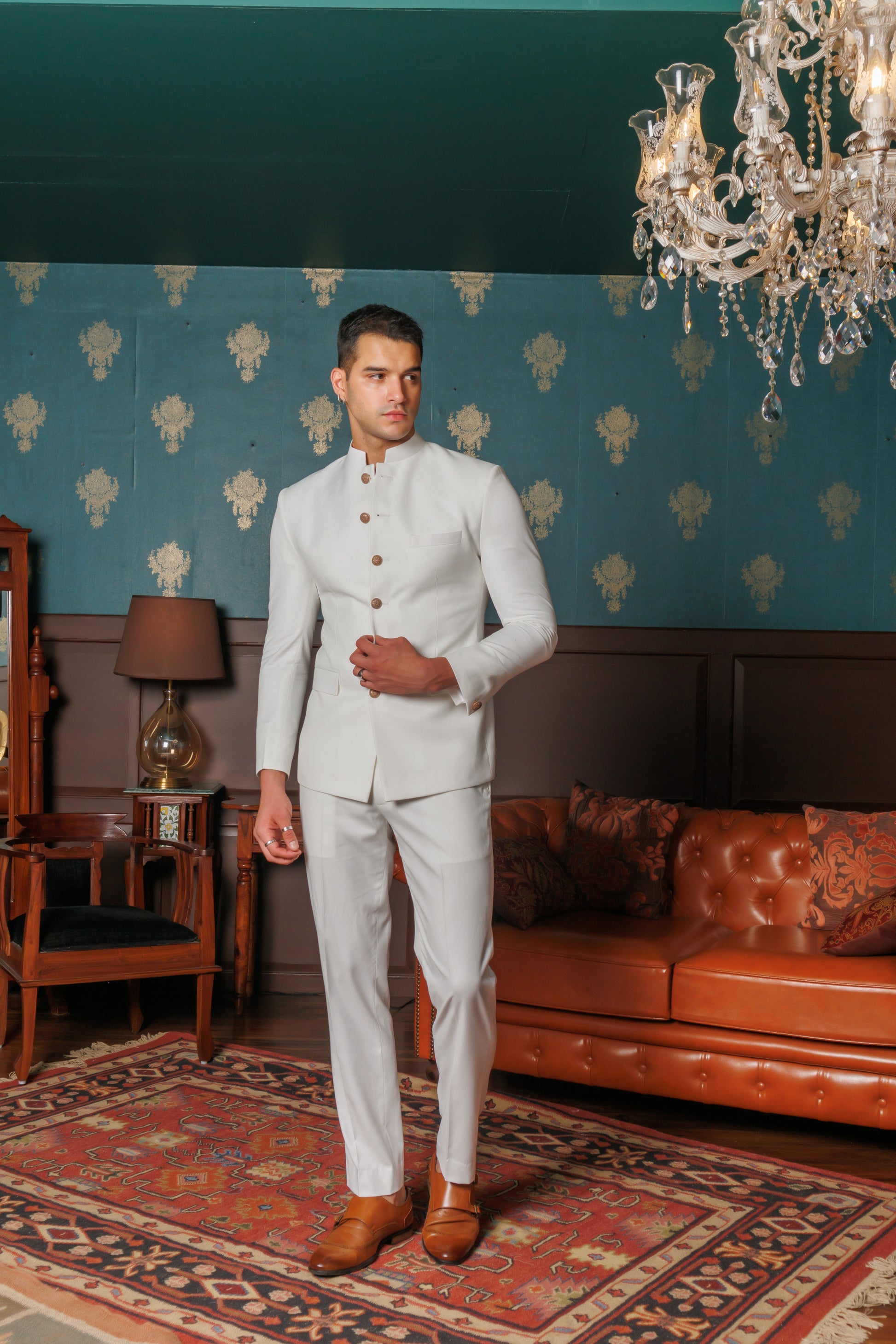 This pristine white bandhgala jacket finished with antique gold buttons exudes regality. Paired with impeccably tailored white trousers, this ensemble epitomizes grace and charm. Elevate your style, embrace the essence of purity.