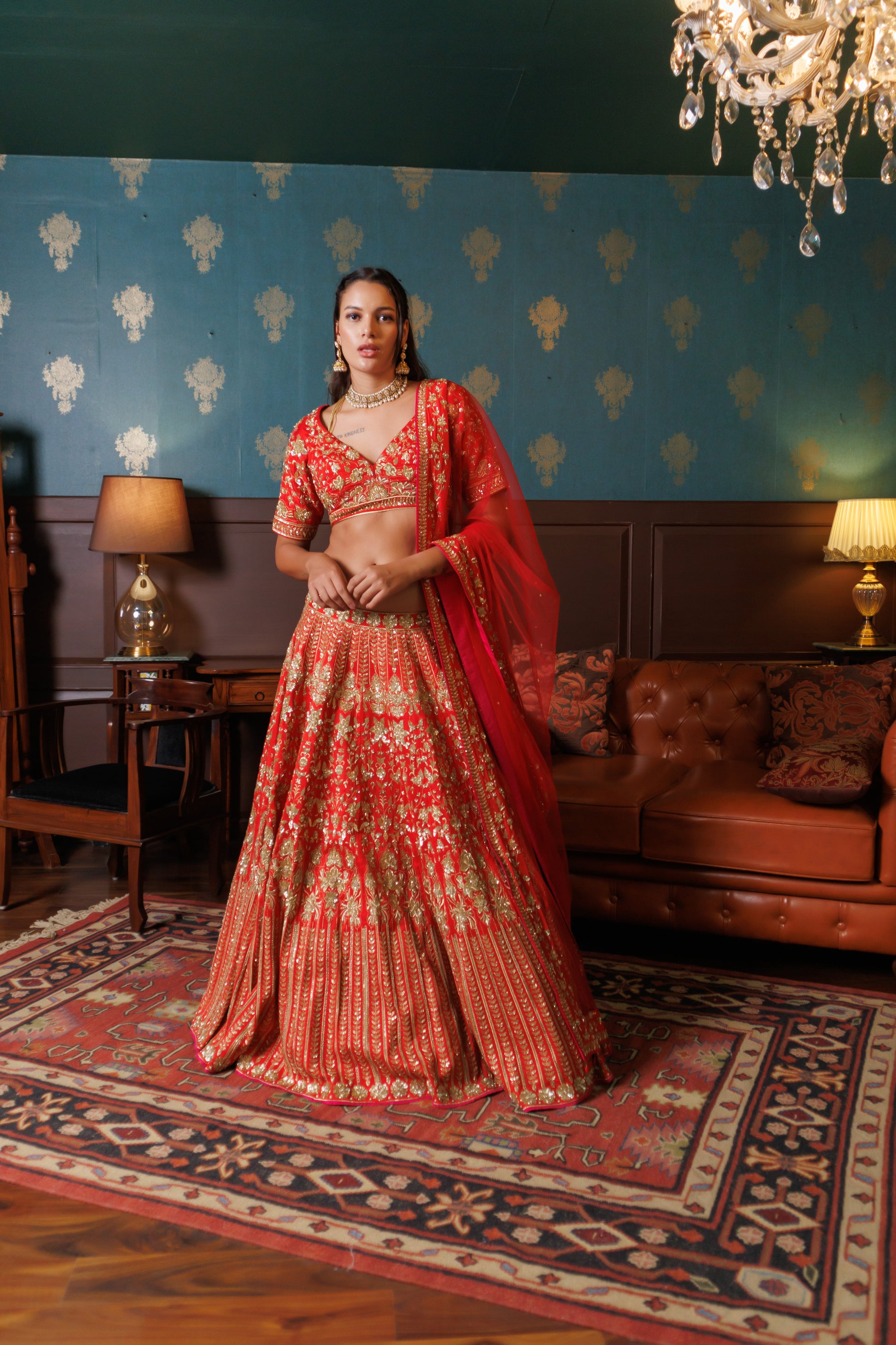 Embrace tradition in our signature red silk bridal lehenga with intricate gold zari, sequin and zardozi work. A classic that reigns supreme amidst passing fads and perfect for brides who are looking for an elegant lehenga to have fun in and move with ease.