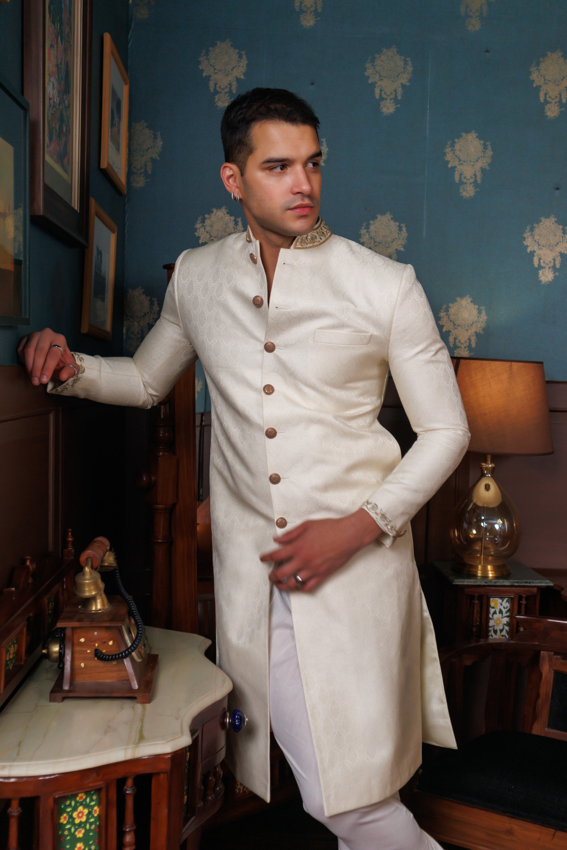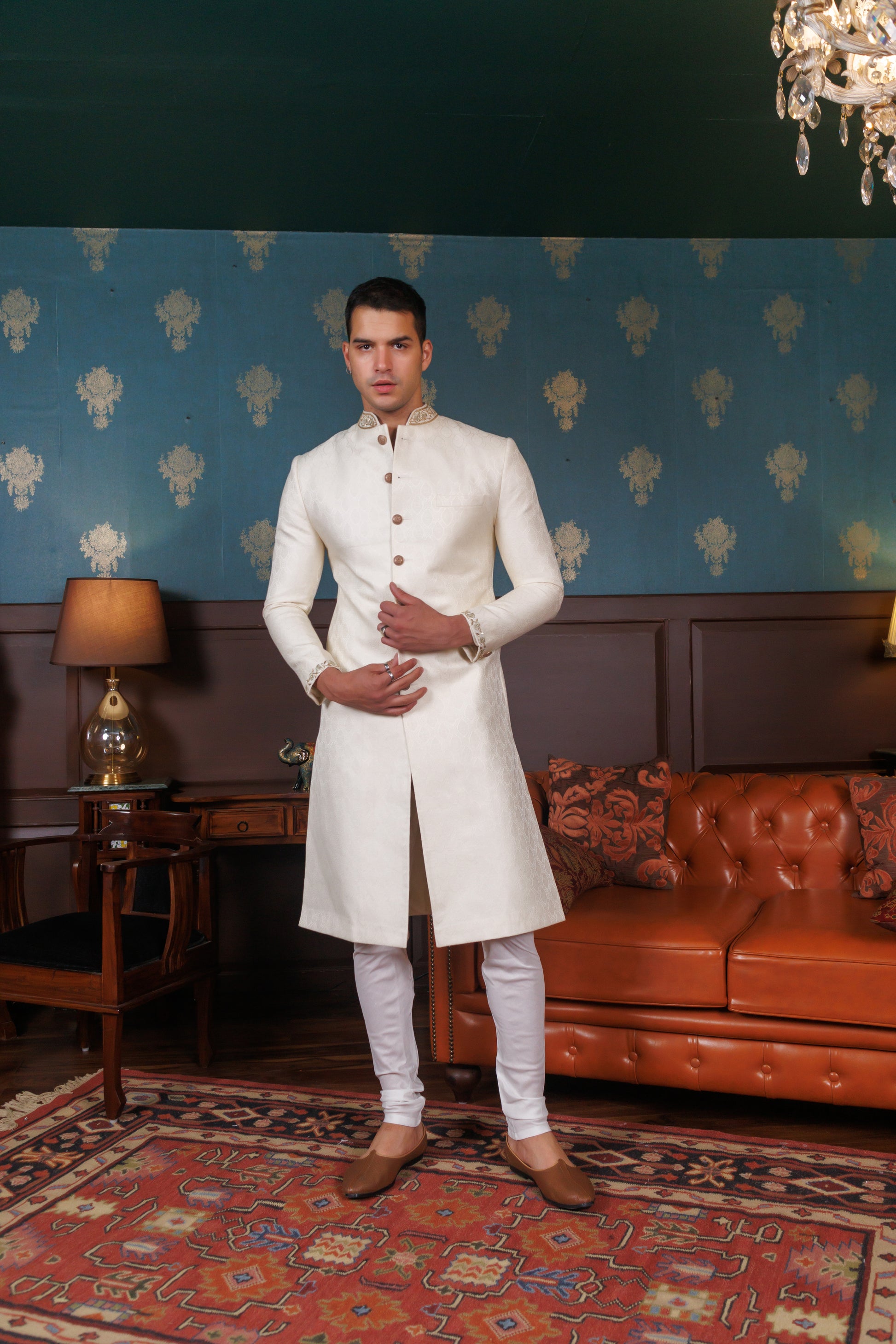An elegant white Sherwani with a brocade self textured design, intricately finished with zardozi and zari work around the neck and sleeves and tied together with antique gold buttons. Paired with a white churidar.