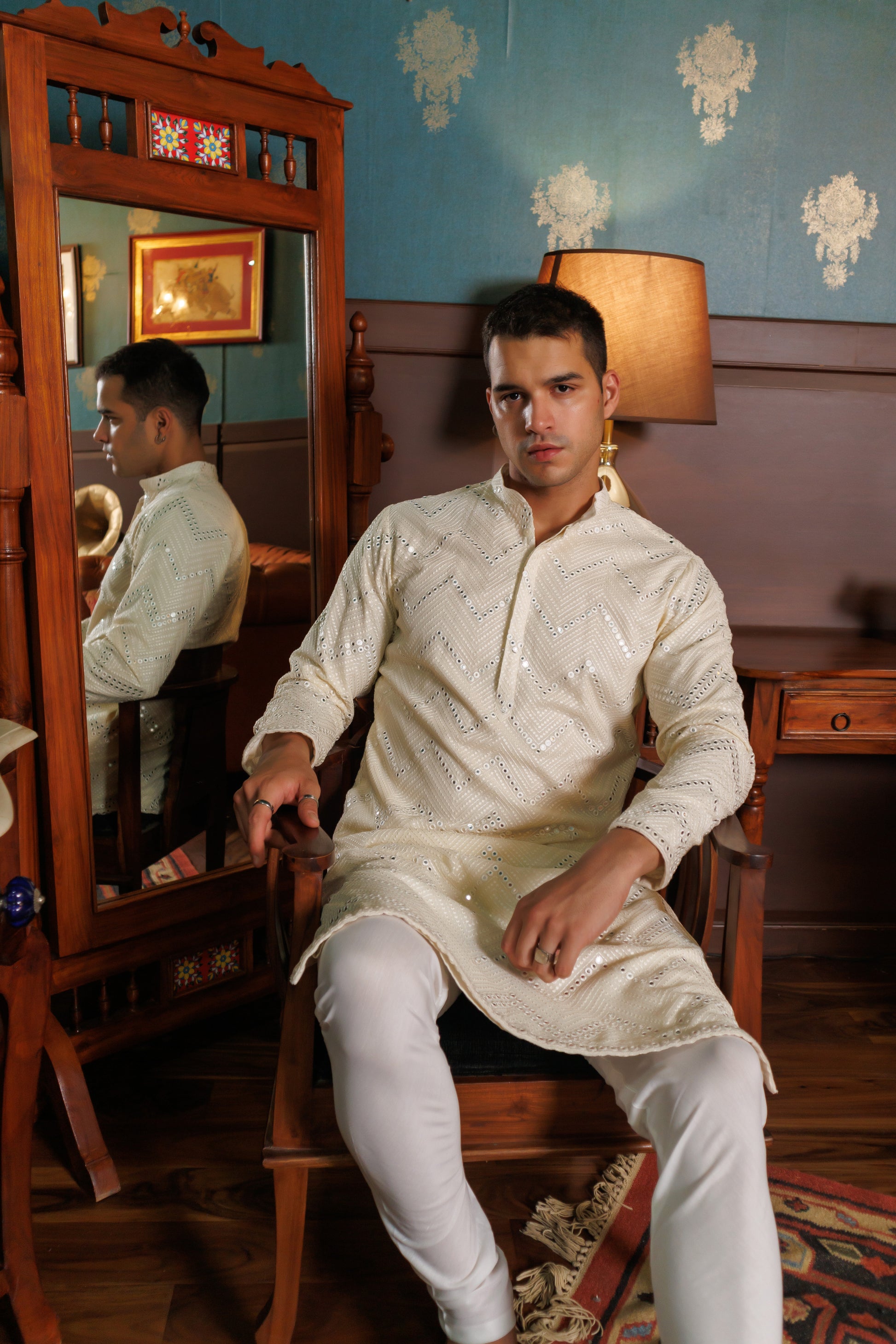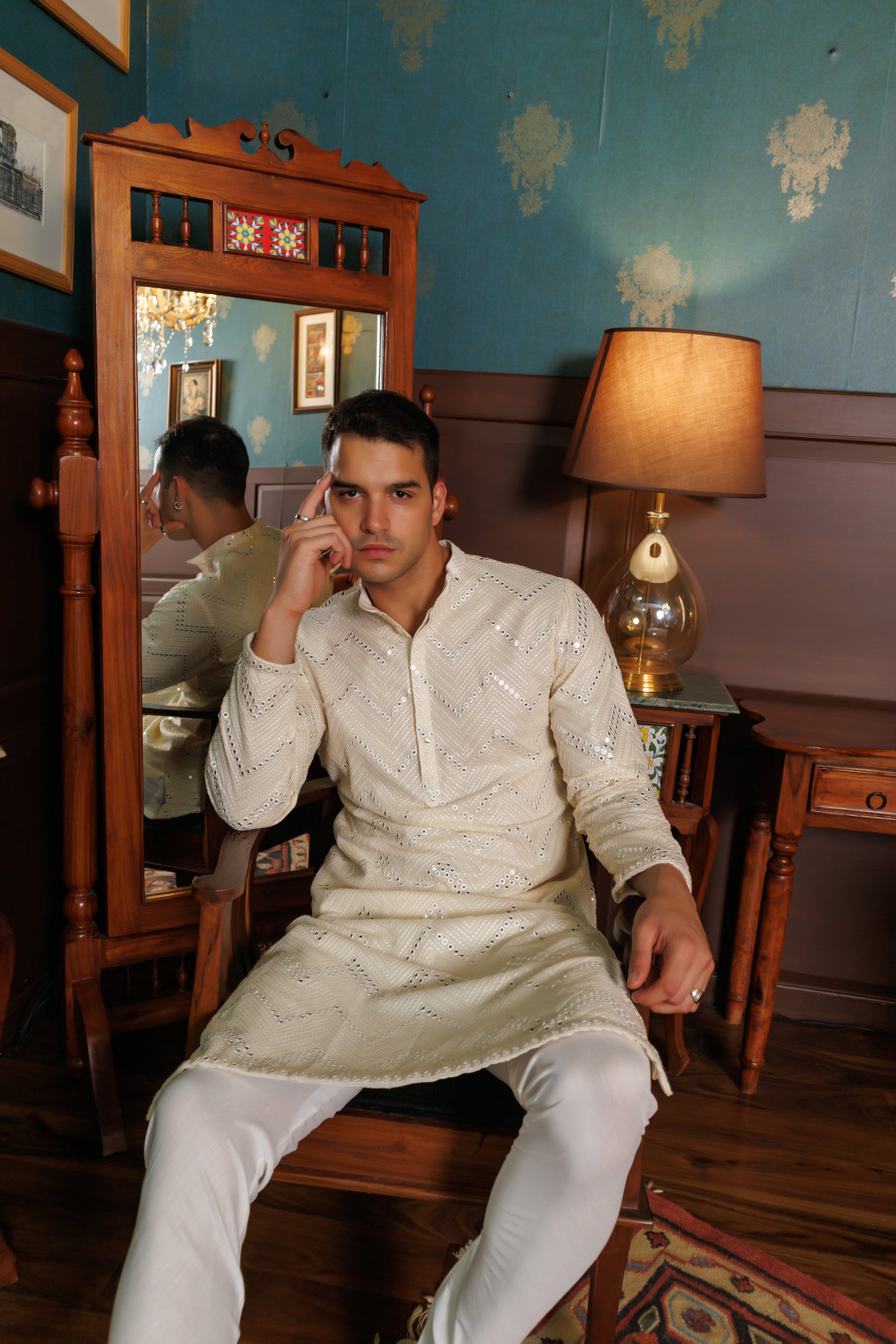 Crafted from cream coloured georgette fabric embellished with mirror work, this look reflects the allure of heritage with a touch of modern elegance.