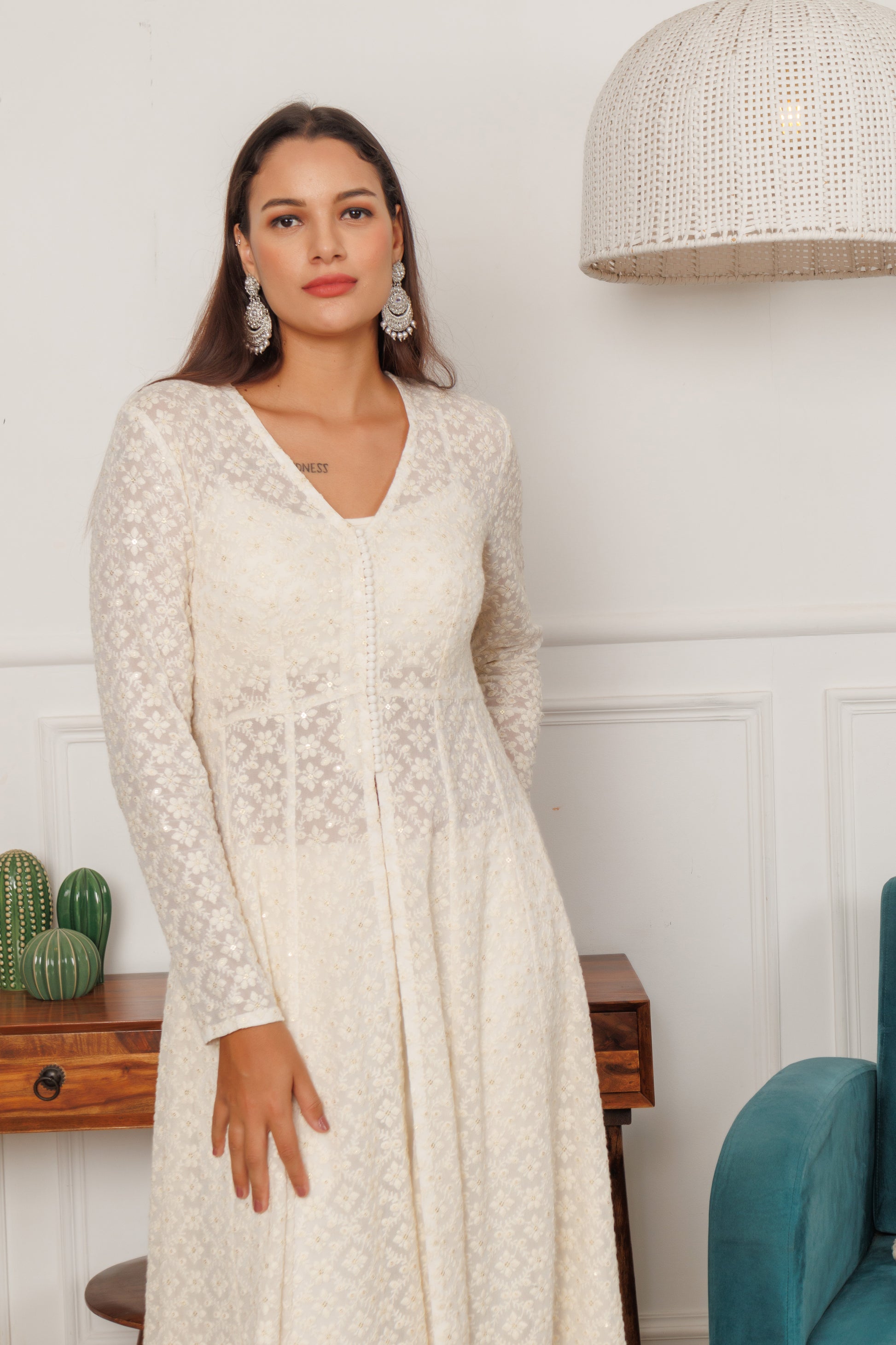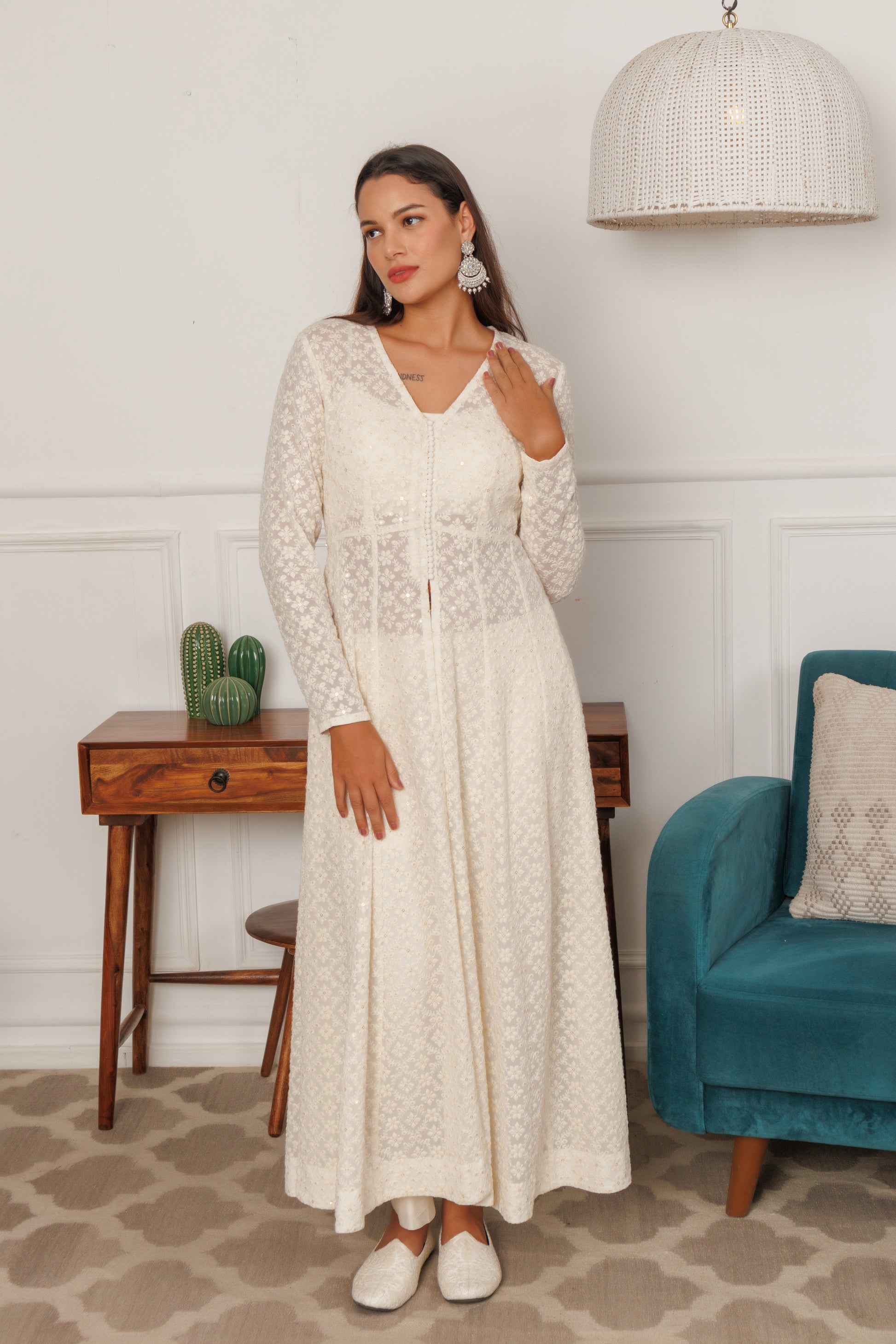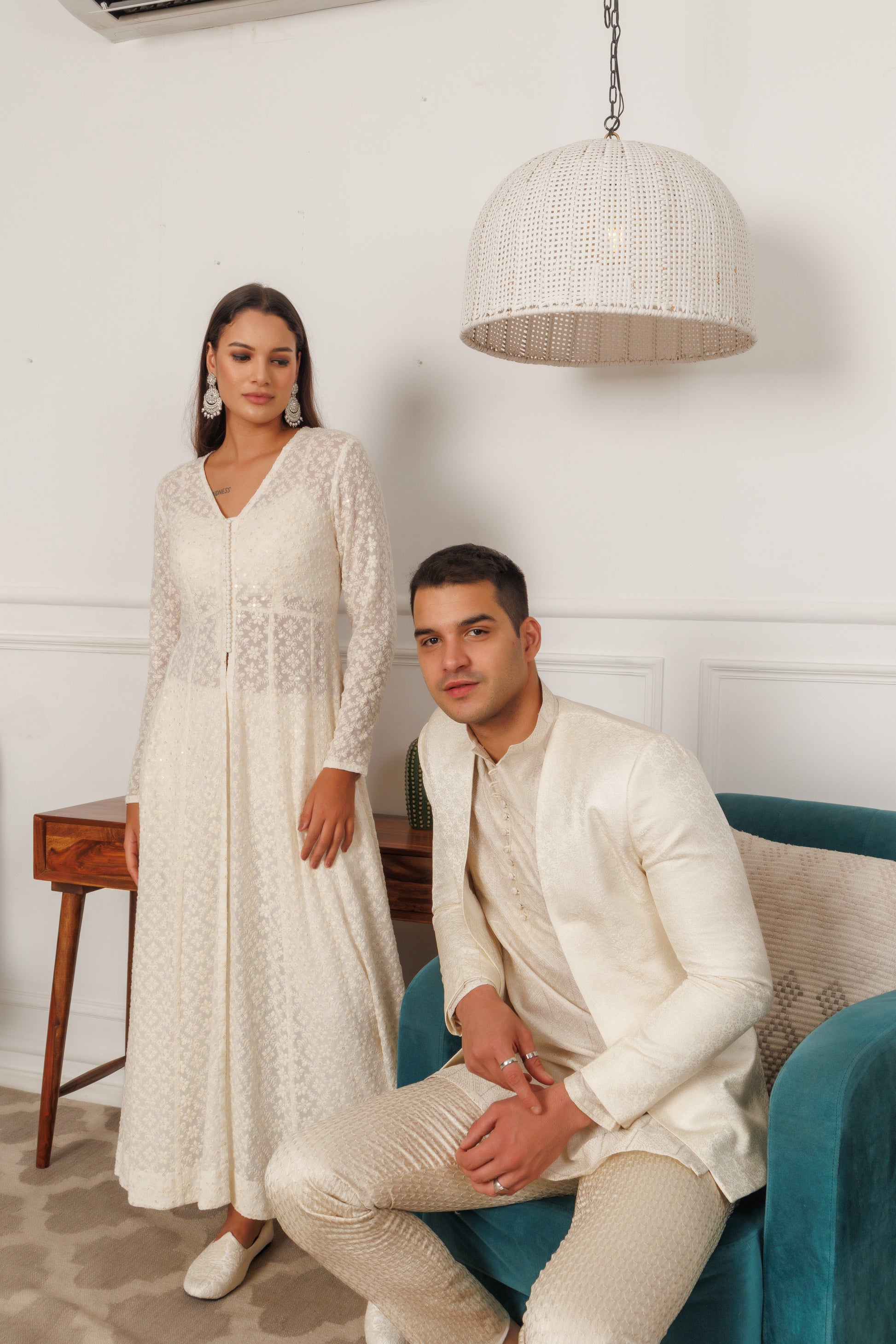 Embody elegance in our embroidered georgette cape set. The sheer georgette lends an air of delicacy, making this look understated yet elegant. Elevated with tonal thread work and paired with pure silk chanderi tube top and pants.