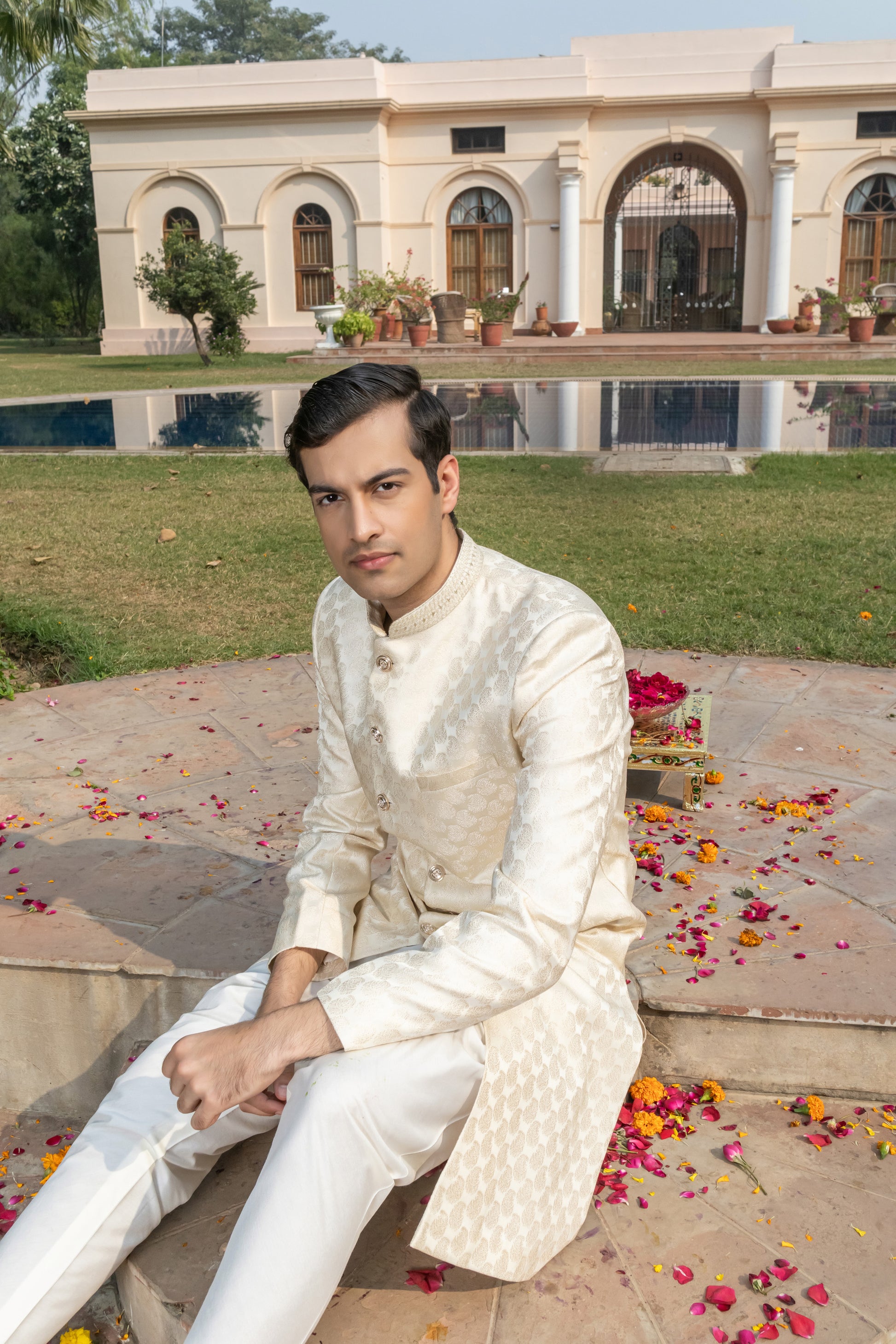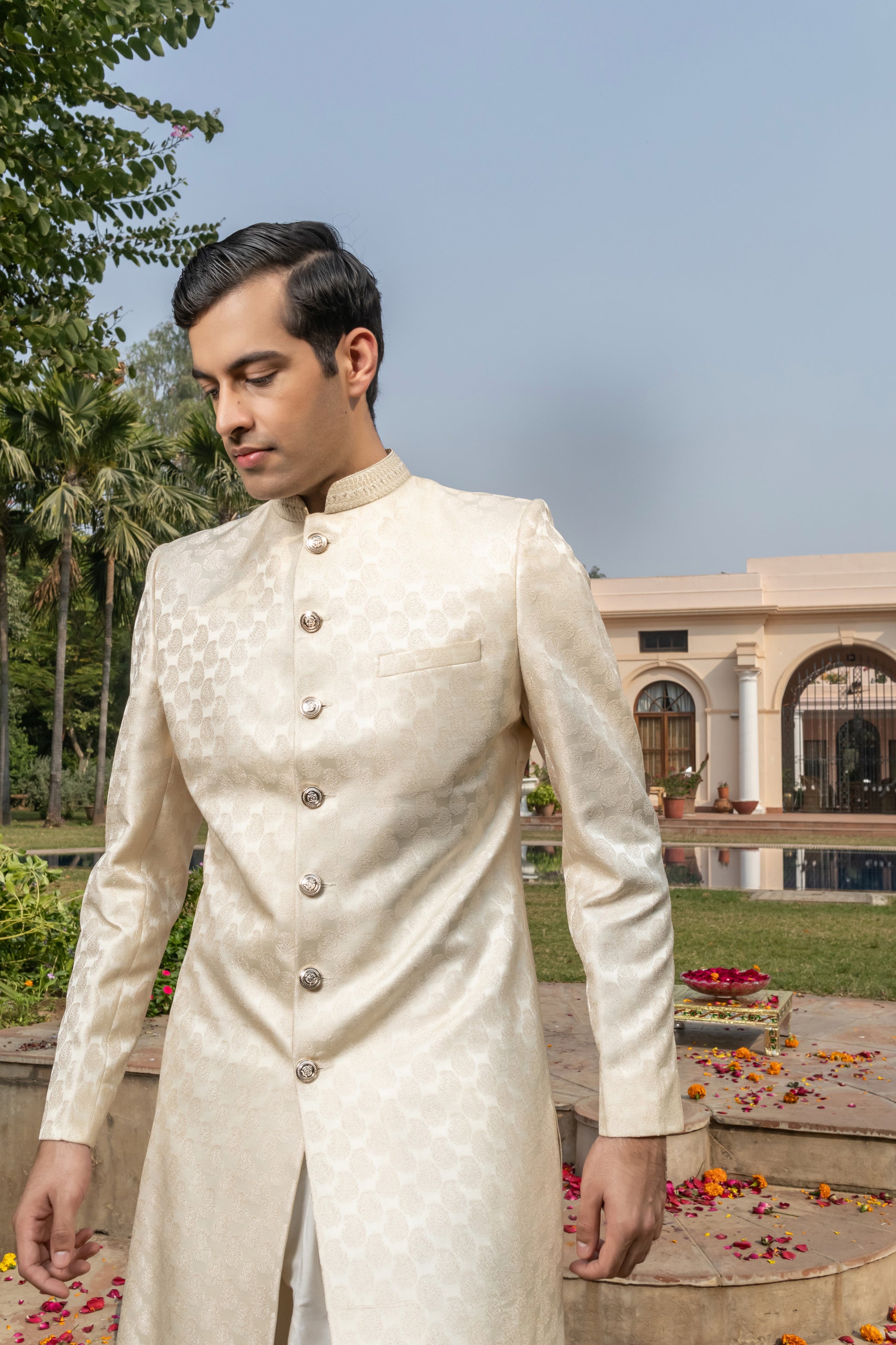 Paired with tonal trousers, the ensemble is perfect for wedding rituals or reception evenings, making it ideal for the groom or anyone seeking a look that blends heritage with modern finesse. A piece that speaks softly — but stands tall.