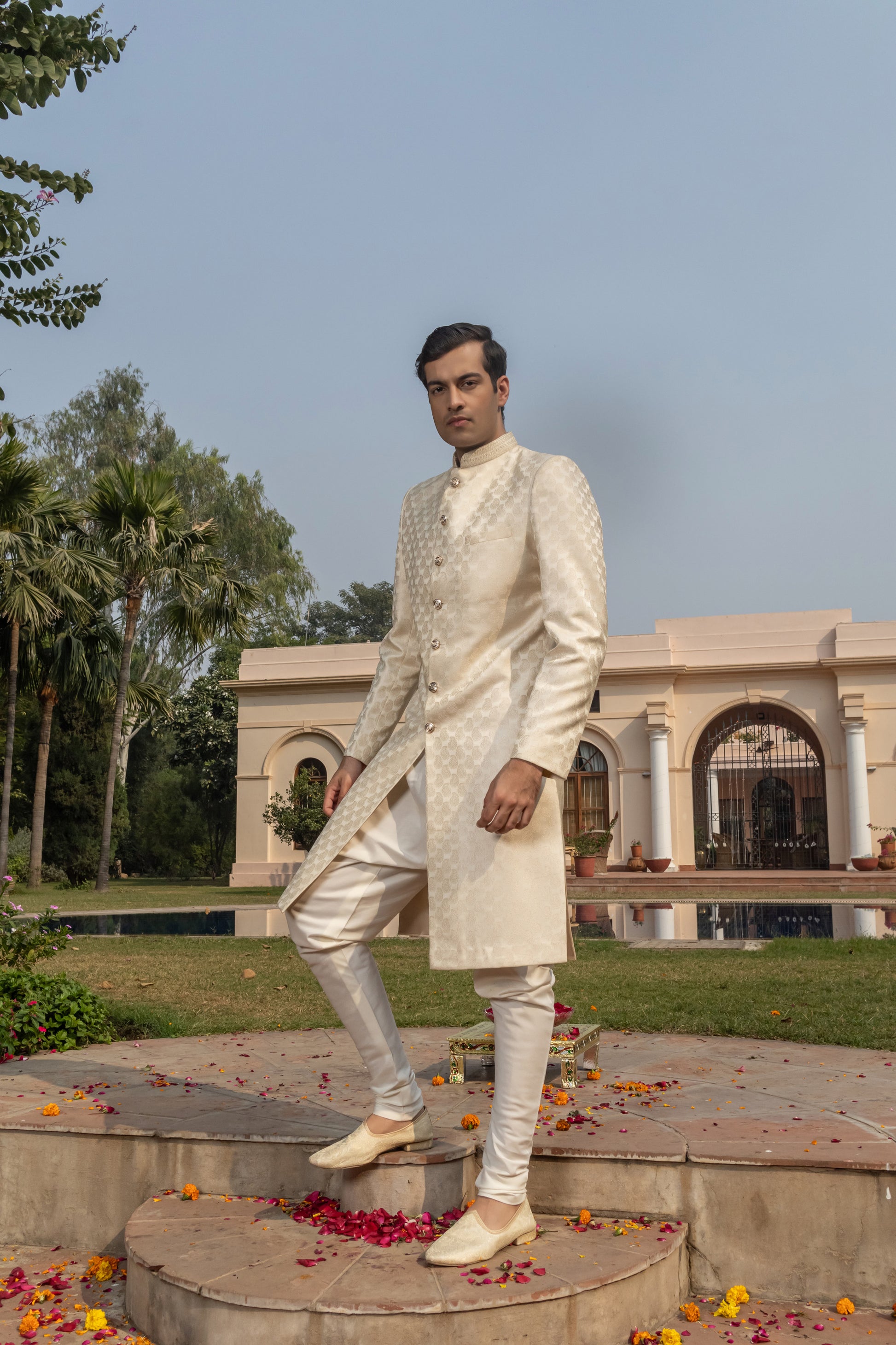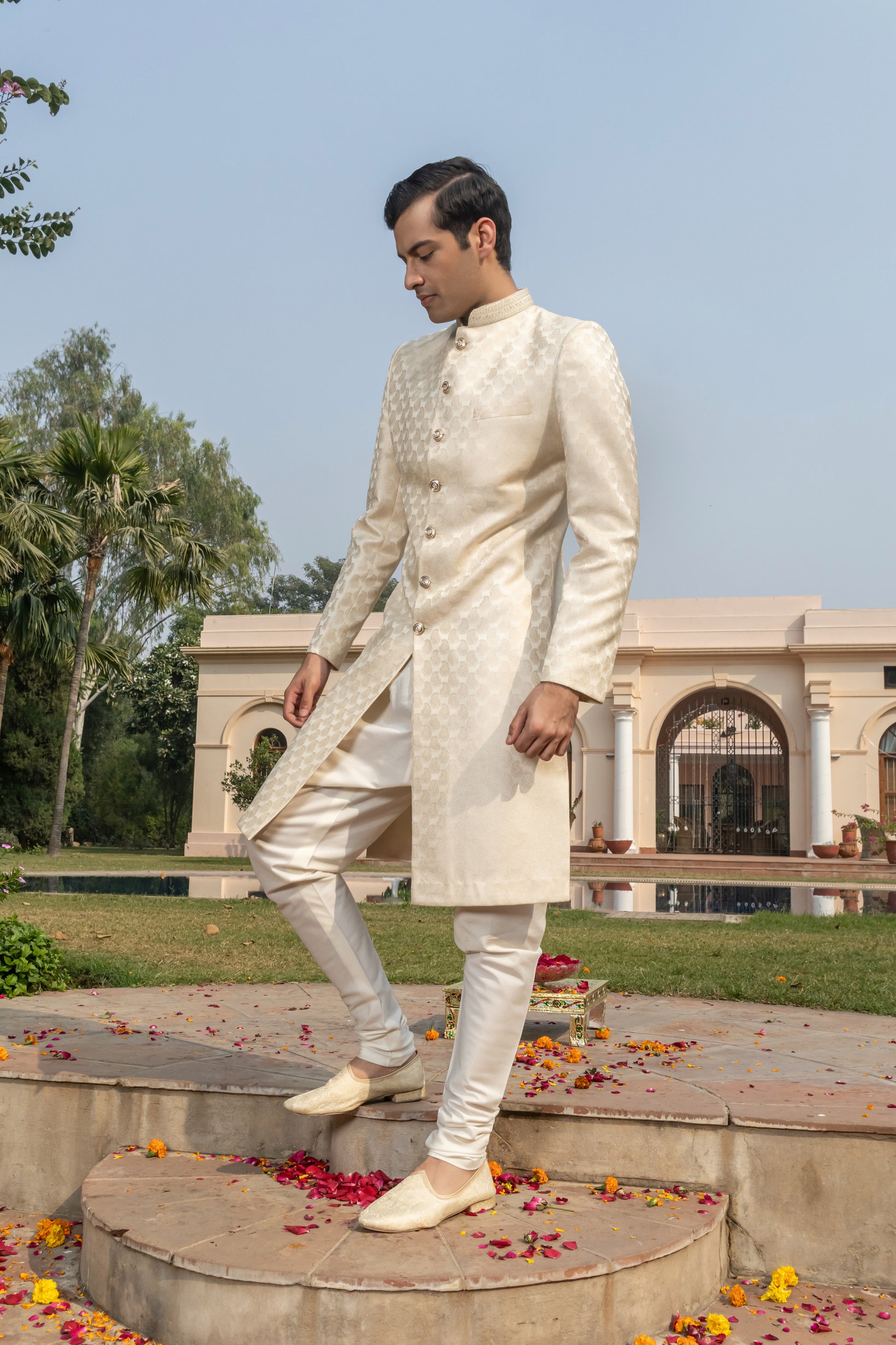 Timeless and refined, this cream-white Lucknowi sherwani exudes quiet sophistication. The intricate chikankari-inspired embroidery offers texture and grace, while the achkan-style silhouette lends structure and ceremonial presence.