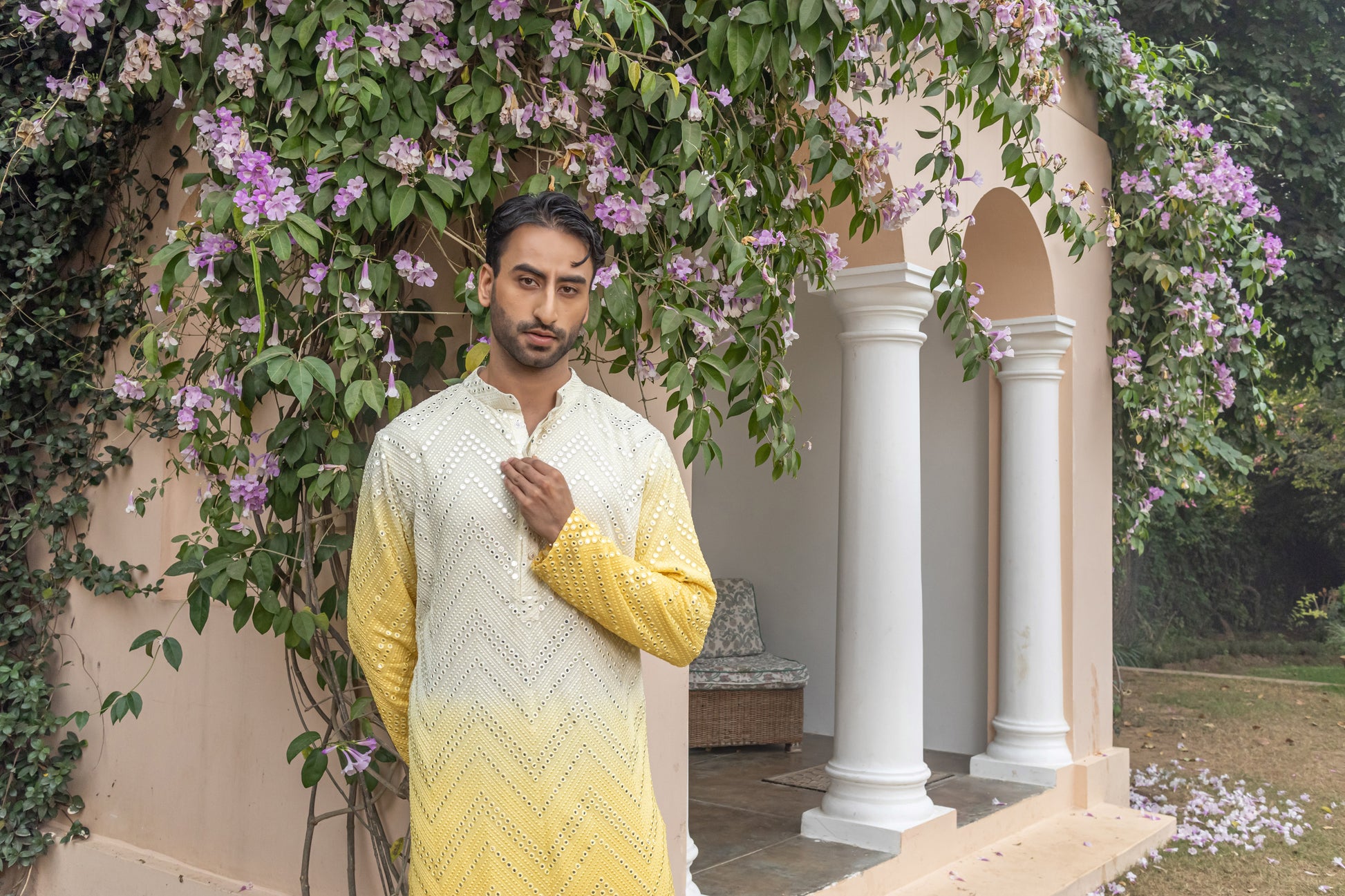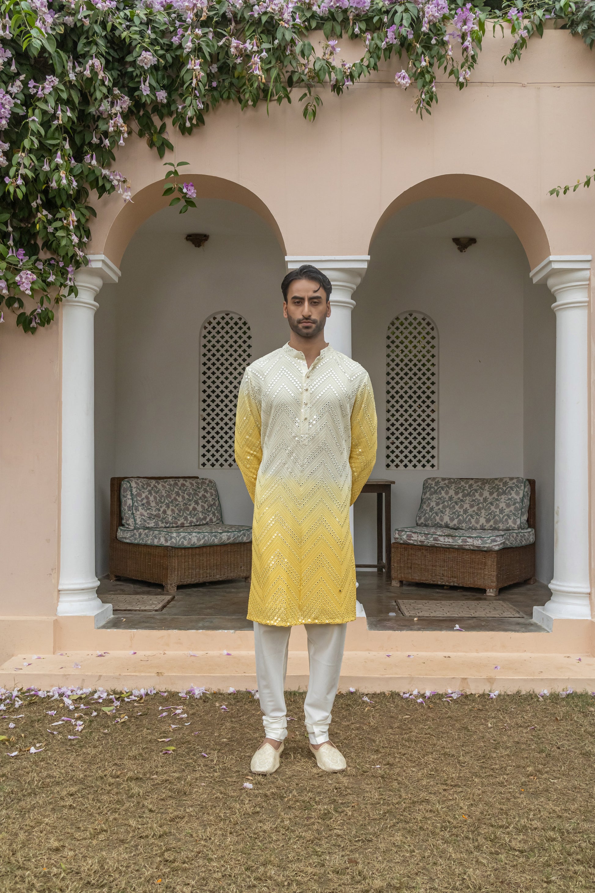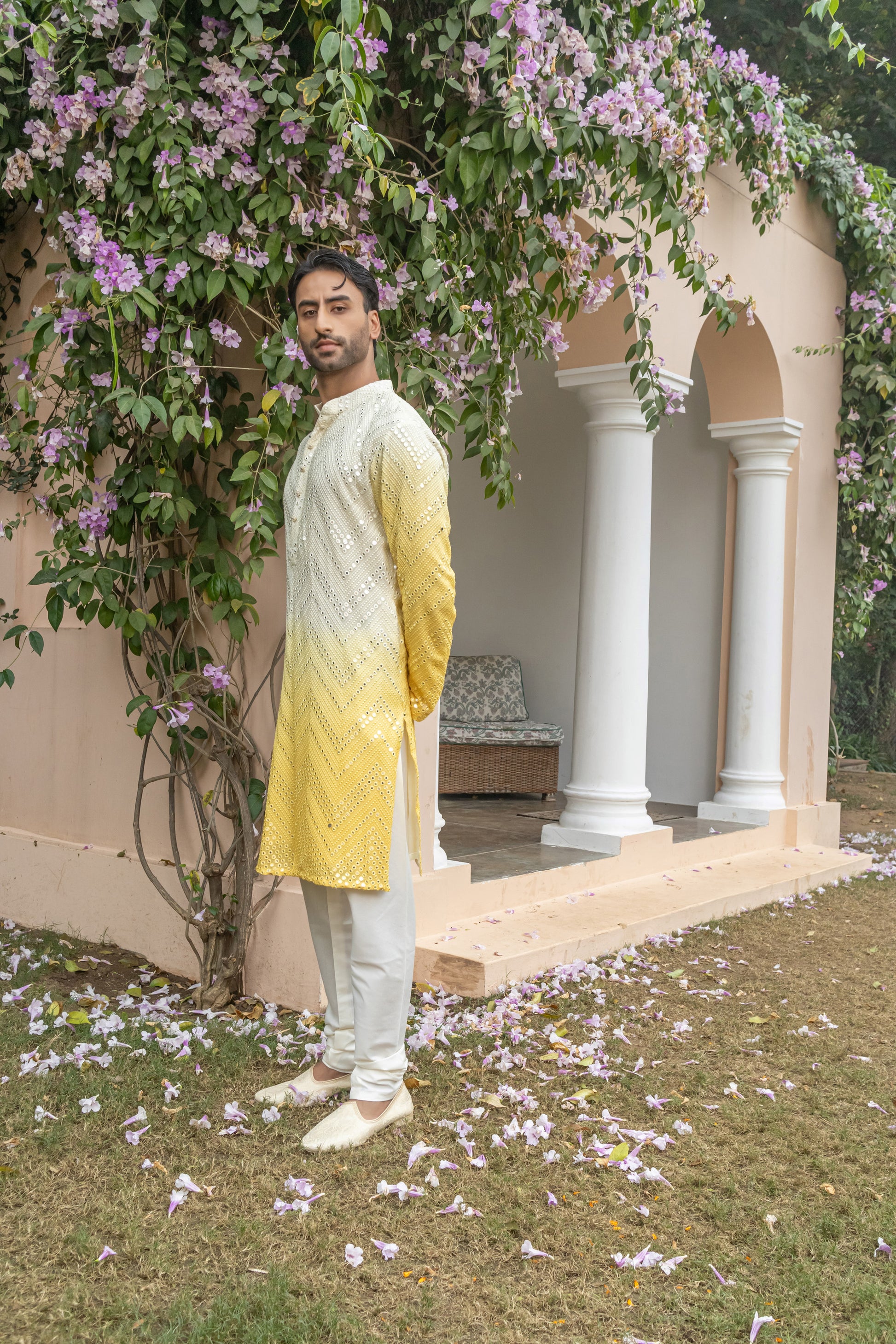 Celebrate in sunshine and silk with this ombré ivory to yellow georgette kurta, intricately adorned with Patra work. Paired with a classic ivory cotton-silk churidar, the look is a seamless blend of modern silhouette and heritage craft.