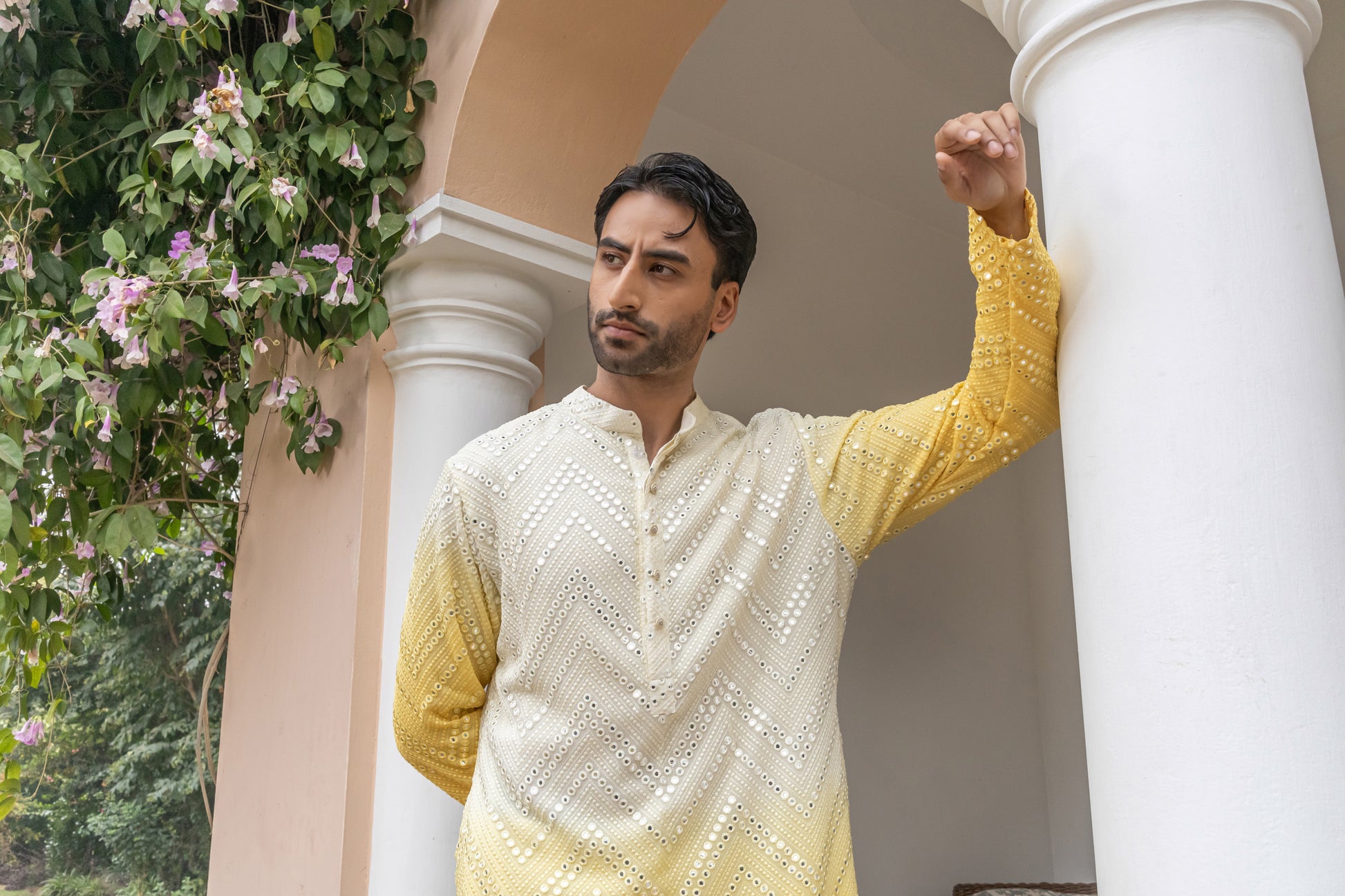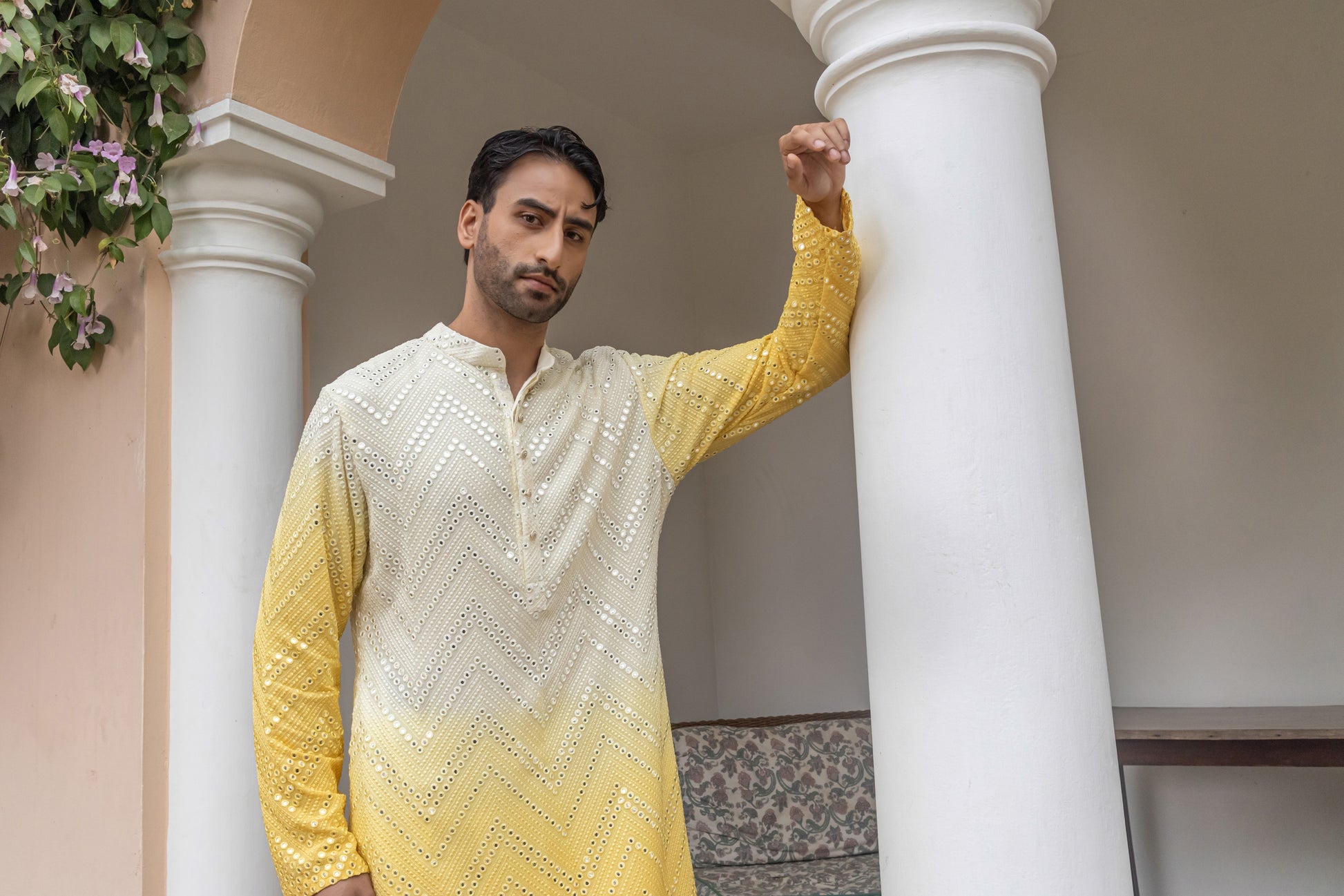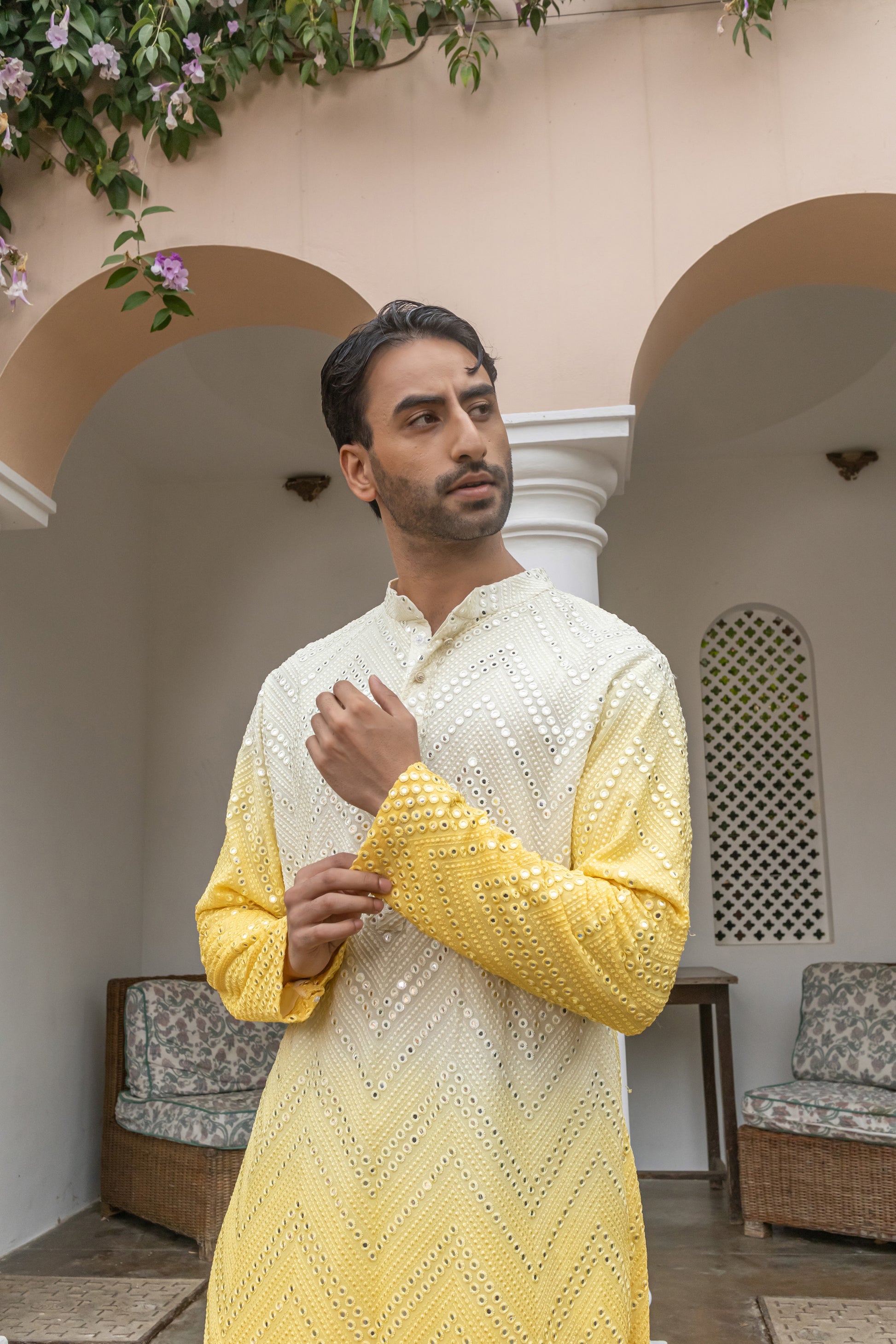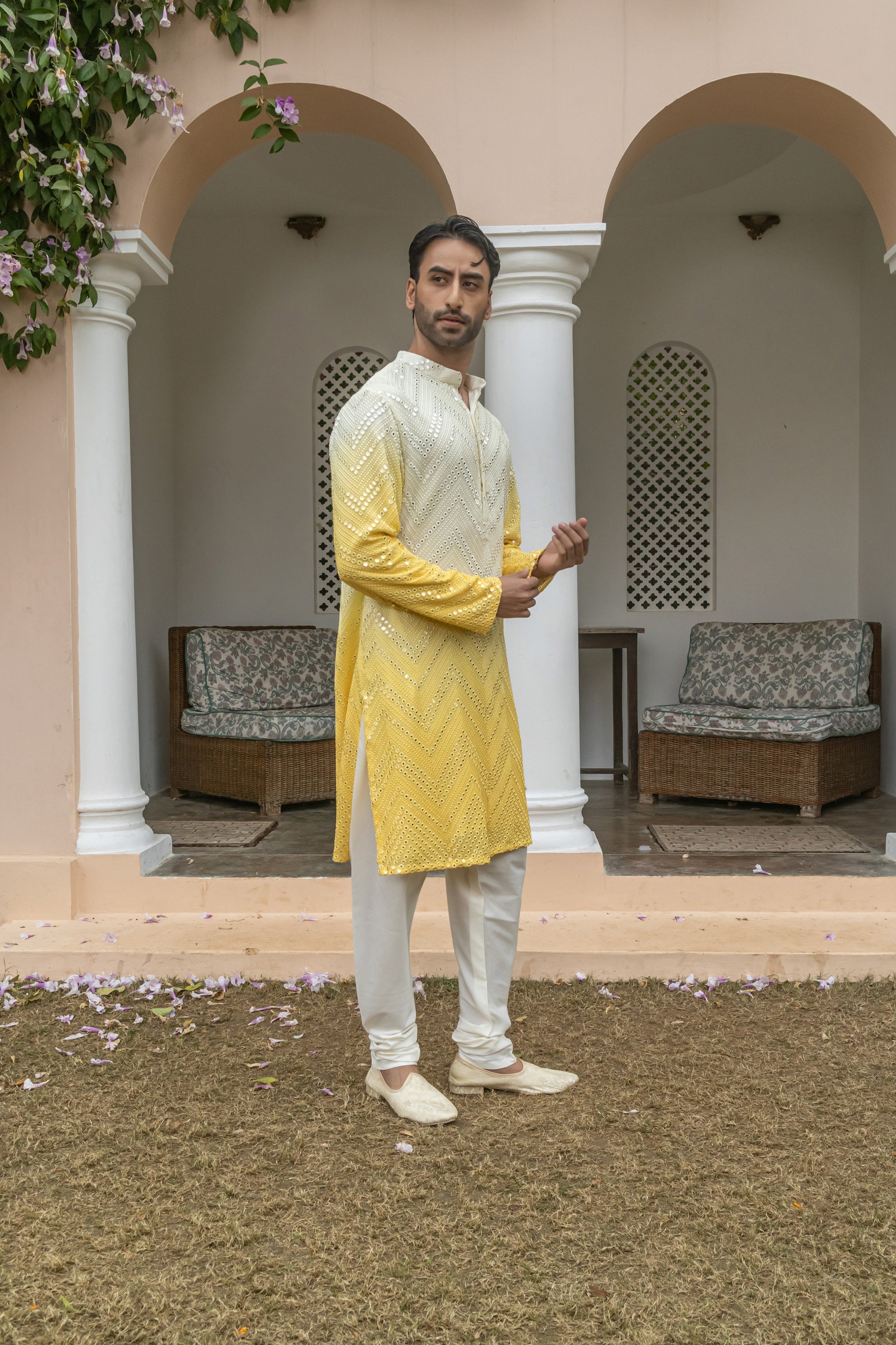 Celebrate in sunshine and silk with this ombré ivory to yellow georgette kurta, intricately adorned with Patra work. Paired with a classic ivory cotton-silk churidar, the look is a seamless blend of modern silhouette and heritage craft.