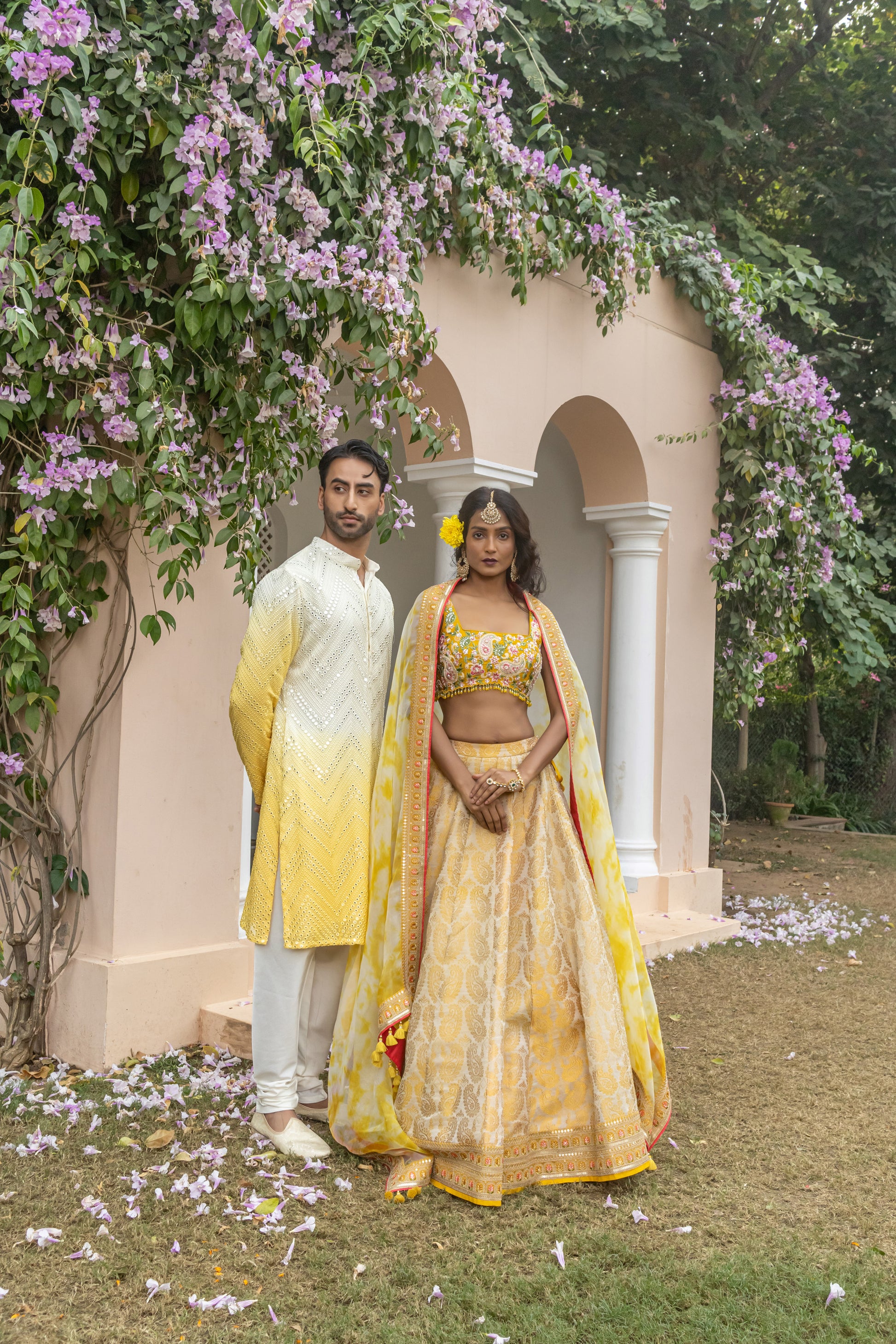 Effortlessly radiant and light on the skin, this set is ideal for haldi, daytime weddings, or pre-wedding rituals, where tradition meets colour-play in the most elegant way.