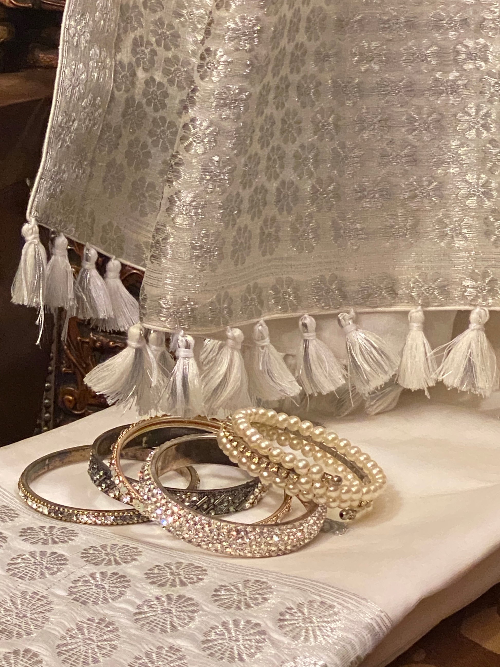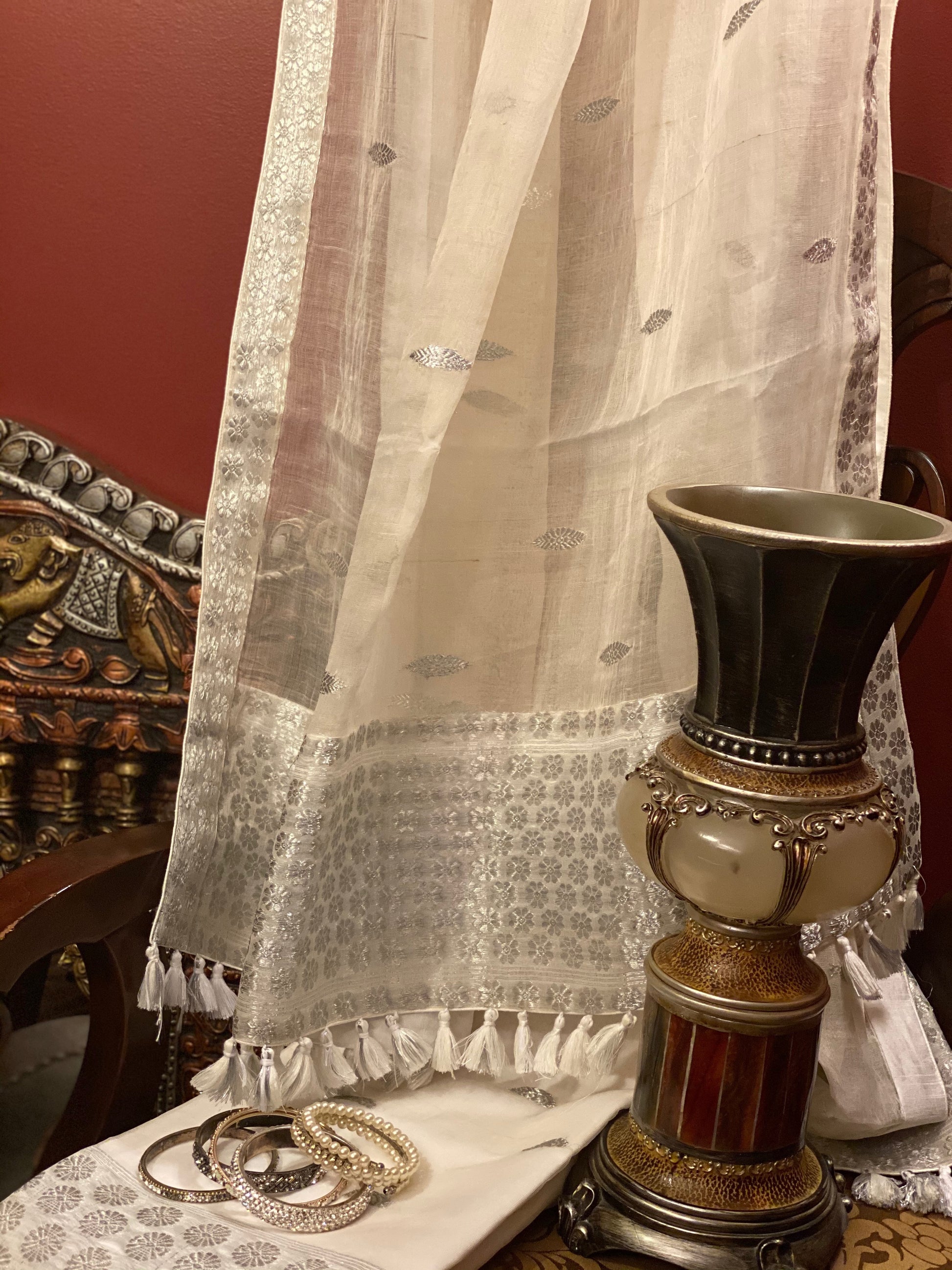 Our White Nooni Paat Silk Mekhela Chadar handwoven with silver zari is an elegance that never fades. Hand woven with zari buta all over and brocade pallu/aanchal, highlighted with swarovski crystals and katdana work on aanchal and saree border. Pure silk finishing is in all our sarees.