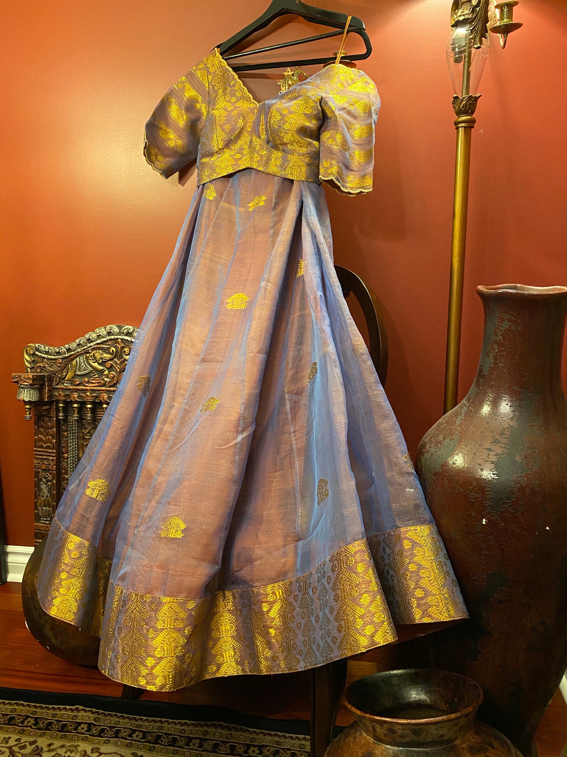 Our Handwoven Dual-Tone Purple and Bronze Assam Paat (Silk) Lehenga is ideal for party wear, wedding, or bridal function. This lehenga is complemented by dual-tone mustard and purple dupatta with Swarovski handwork.